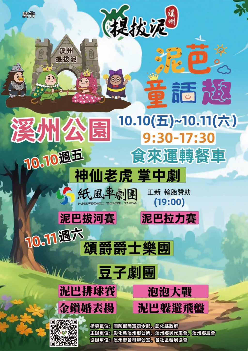 一、 | 2025「溪州提拔泥-泥芭童話趣」活動將於114年10月10日(五)、10月11日(六)在溪州花博公園盛大登場,活動內容包括豆子劇團、掌中劇、頌爵爵士等舞台演出,並有手作體驗、夏日熱鬥泥巴競賽、氣墊遊戲區、小農文創市集等系列活動。 |