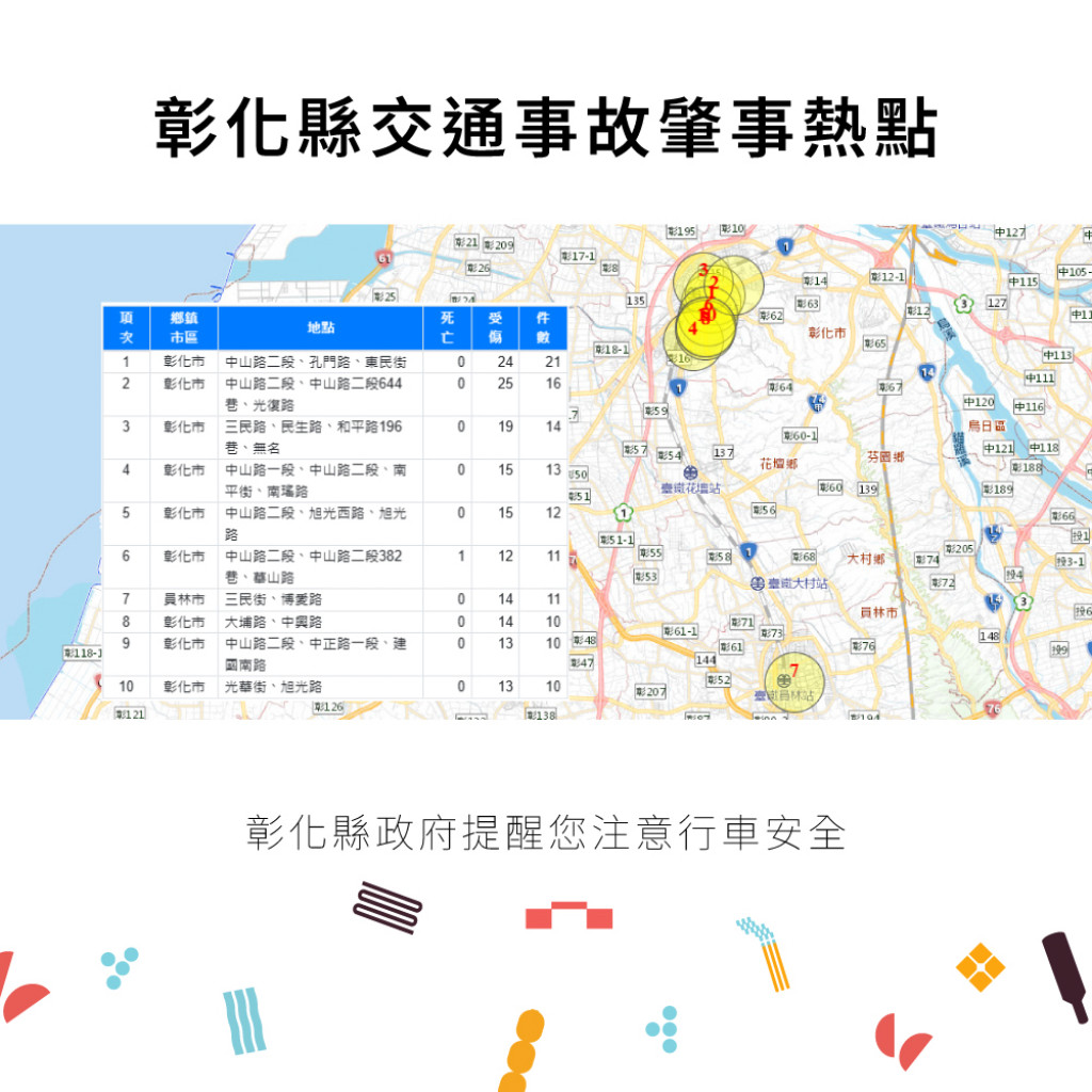 附件為「114年1-6月全國道路交通事故統計、彰化縣交通事故總覽、本縣各鄉鎮市每千人死傷人數及肇事熱點」共4份統計資料宣導圖,社群宣導內容可參閱或分享本處「花現彰化-2025台灣設計展」(https://reurl.cc/mYjXKA)臉書粉絲專頁。 |