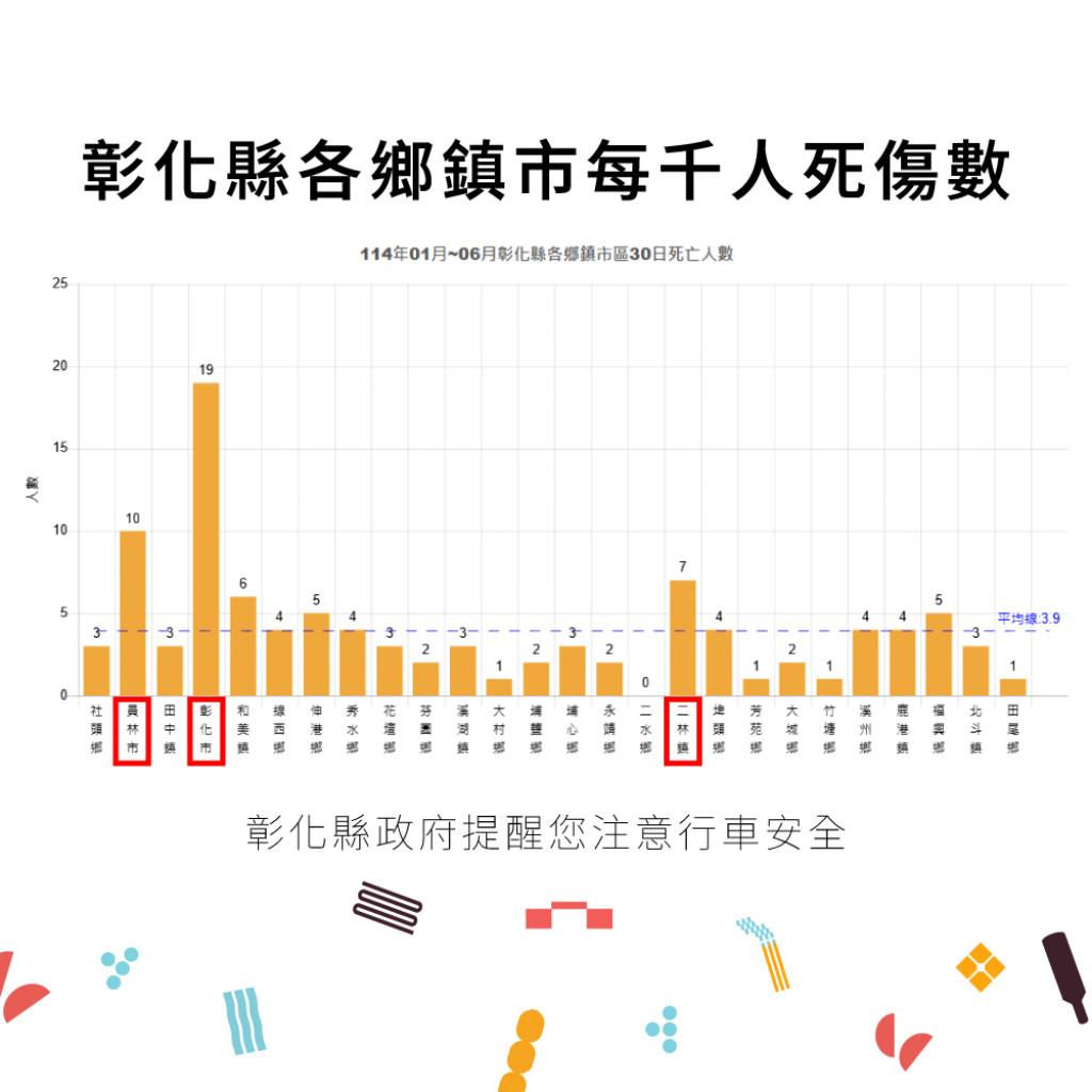根據交通部道安資訊查詢網統計快覽數據跟112年同期比較分析,以少年自行車騎士(含電自、電輔) 事故增加47.7%最高,外籍人士事故增加38.6%次之,自小客車駕駛人增加25.4%再次之。1-6月份30日鄉鎮市每千人死傷人數於「彰化市、員林市、二林鎮」為多,肇事熱點以「彰化市」為多,合先敘明。 |