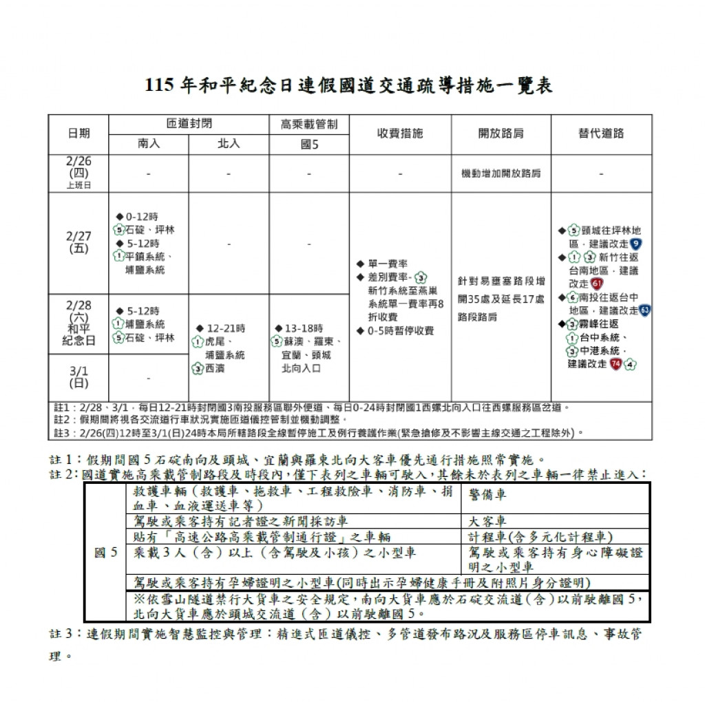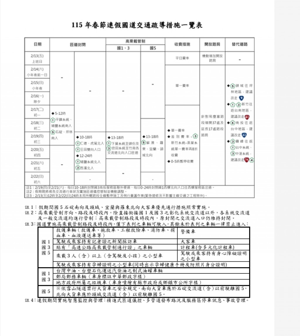 交通部高速公路局「115年春節連續假期國道交通疏導措施一覽表」及「115年和平紀念日連續假期國道交通疏導措施一覽表」