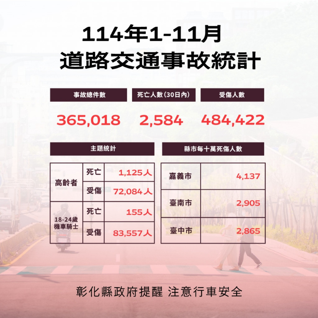 附件為「114年1-11月全國道路交通事故統計、彰化縣交通事故死傷人數增加排行、本縣各鄉鎮市30日死亡人數、肇事熱點及交通事故肇因統計」共5份統計資料宣導圖,社群宣導內容可參閱或分享本處「花現彰化-彰化縣政府新聞處」(https://pse.is/8qxh9f)臉書粉絲專頁。 |