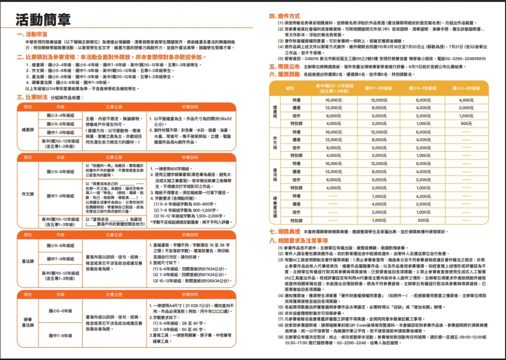 | 三、徵稿日期:自115年3月18日起至7月20日止,以郵寄方式繳交作品。收件人:梅家瑜小姐,收件地址:新北市新莊區五工路99之2號5樓。 |