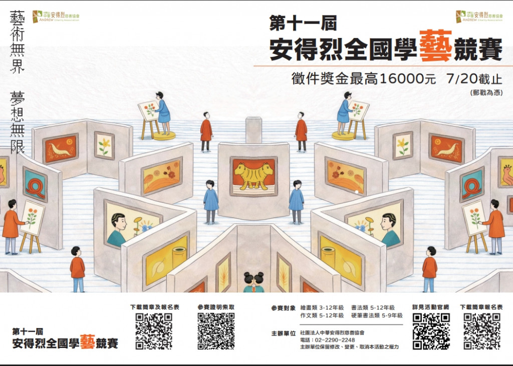 | 一、安得烈慈善協會(以下簡稱本會)為增進台灣偏鄉、清寒弱勢家庭學生閱讀寫作、美術繪畫及書法的興趣與能力,特別舉辦學藝競賽活動,以激發學生在文字、繪畫方面的想像力與創作力,並提升書寫美學,鼓勵學生發揮才華。 |